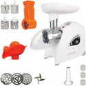 Номинальная мощность: 250 Вт • Реверс: есть • Производительность: 2 кг/мин • Насадки-решетки: Есть, 3 штуки • Прочие насадки: для приготовления кеббе, для приготовления колбас • Отделение для хранения насадок: есть • Резиновые ножки: есть • Лоток для подачи продуктов: есть, пластик • Цвет корпуса: белый • Материал корпуса: пластик • Отделение для хранения кабеля: есть • Количество уровней мощности: 1 уровень