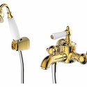 Назначение: ванна+душ • Конструкция: двухрычажный • Монтаж: вертикальный • Клапан: керамический • Материал: латунь, покрытие - бронза • Подводка: жесткая • Монтажные отверстия: 2 отверстия • Форма излива: традиционная • Душевая лейка в комплекте: есть • Держатель для душевой лейки: настенный держатель • Аэратор: есть • Эксцентрики в комплекте: есть
