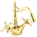 Назначение: для биде • Конструкция: двухрычажный • Монтаж: горизонтальный • Материал: латунь, покрытие - золото • Монтажные отверстия: 1 отверстие • Форма излива: традиционная • Душевая лейка в комплекте: нет • Аэратор: есть • Донный клапан в комплекте: есть