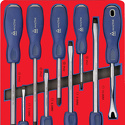 Комплектация• Отвертки силовые шлицевые с двухкомпонентной эргономичной ручкой: 5.5х75, 6.5х100, 6.5х38, 8х150, 10х200 мм;• Отвертки силовые крестовые с двухкомпонентной эргономичной ручкой: 1х75, 2х100, 2х150, 3х150 мм;• Съемник клипс и пистонов с двухкомпонентной эргономичной ручкой 115 мм.
