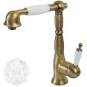 Назначение: кухонный • Конструкция: однорычажный • Монтаж: горизонтальный • Клапан: керамический • Материал: латунь, покрытие - золото • Подводка: гибкая • Монтажные отверстия: 1 отверстие • Форма излива: традиционная • Аэратор: есть • Донный клапан в комплекте: есть